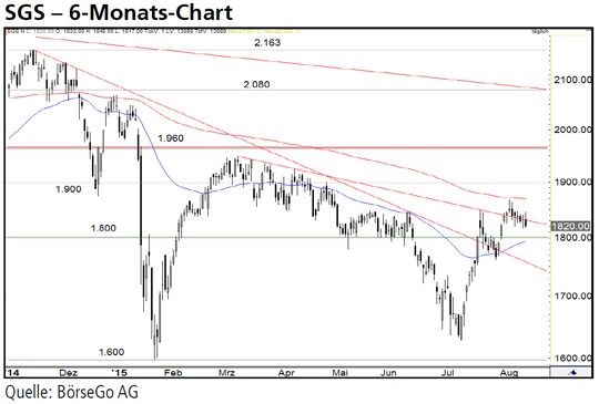 Ausblick: Die Aktien von SGS befinden sich zwar weiterhin in einem langfristigen Abwärtstrend. Die jüngste Entwicklung deutet aus unserer Sicht jedoch darauf hin, dass die Bullen an einer übergeordneten Trendwende arbeiten. Die Long-Szenarien: Oberhalb der 1.800 CHF-Marke sind die Bullen bei den Aktien weiter tonangebend und dürften eine weitere Kaufwelle bis an die Barriere bei 1.900 CHF auslösen. Ein Ausbruch über die Marke würde kurzfristig für Aufwärtspotenzial bis an den markanten Widerstand bei 1.960 CHF sorgen. Gelingt der Käuferseite auch der Anstieg über diese Barriere, wäre bereits mit einer mittelfristigen Fortsetzung der Aufwärtsbewegung und Zugewinnen bis 2.080 und 2.182 CHF zu rechnen. Die Short-Szenarien: Erst ein deutlicher Einbruch unter die 1.800 CHF-Marke würde den weiteren Anstieg der Aktien zeitlich verzögern und eine Korrektur bis 1.750 CHF einleiten. Ausgehend von diesem Unterstützungsbereich sollte sich der Aufwärtstrend seit Anfang Juli jedoch unvermindert fortsetzen. Würde diese Marke im weiteren Verlauf dagegen ebenfalls unterschritten, wäre der Anstieg neutralisiert und eine Verkaufswelle bis an die markante Unterstützung bei 1.600 CHF wahrscheinlich.