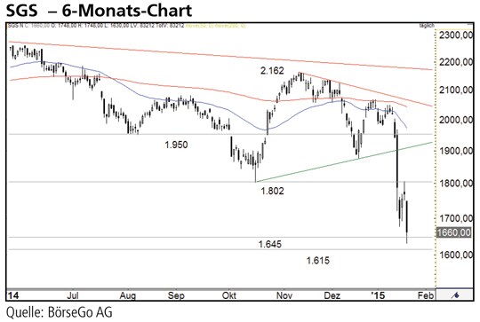 Ausblick: Auf keiner Zeitebene lassen sich Argumente für einen positiven Ausblick bei den Aktien von SGS finden. Einzig der überverkaufte Zustand könnte kurzfristig zu einer Erholungsbewegung führen. Die Trends zeigen indes weiter klar abwärts. Die Short-Szenarien: In den kommenden Tagen dürften die Marken von 1.645 und 1.615 CHF im Fokus stehen. Finden sich dort nicht ausreichend Käufer, dürfte die Abwärtsbewegung anhalten. Der nächste wahrscheinliche Zwischenstopp im Chart lässt sich für dieses Szenario erst wieder bei 1.430 CHF nennen. Der Grund liegt in der steilen Aufwärtsbewegung der Jahre 2011 bis 2013, im Zuge derer kaum Verschnaufpausen und dadurch auch keine belastbaren lokalen Tiefs aufgetreten sind, die jetzt als Unterstützungen dienen könnten. Im Langfristchart wiegt vor allem der Bruch der Unterstützung bei 1.724 CHF schwer. Die Long-Szenarien: Hält die erwähnte Unterstützungszone oberhalb von 1.600 CHF, könnte die Aktie sich kurzfristig bis auf 1.802 CHF erholen. Bereits an dieser Marke ist eine Wiederaufnahme der Abwärtsbewegung wahrscheinlich. Nur eine Rückeroberung der Marke von 1.950 CHF würde den Chart auf neutral stellen. Unterbrochen wäre der Abwärtstrend sogar erst über 2.048 CHF.