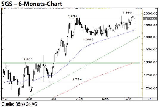 Die Bullen unternehmen weiterhin den Versuch, die Aktien von SGS über die neue Rekordmarke von 1.996 CHF zu katapultieren. Sollte dies auf Tagesschlusskursbasis gelingen, wäre ein weiteres Kaufsignal aktiv. Die Long-Szenarien: Gelingt es der Käuferseite, den Wert über 1.996 CHF anzu- treiben, würde dies ein Kaufsignal generieren, welches man entsprechend mit einem Longengagement handeln könnte. Im Anschluss dürften die Aktien von SGS auf kurze Sicht bis 2.050 CHF ansteigen. Setzt sich die Hausse oberhalb dieser Zielmarke fort, hätte der Wert weiteres Potential bis 2.090 CHF. Langfristig würde ein Anstieg über 2.090 CHF bereits Zugewinne bis 2.160 CHF ermöglichen. Die Short-Szenarien: Scheitert der Ansturm der Bullen dagegen an der 1.996 CHF- Marke, könnte eine leichte Korrektur bis 1.932 CHF einsetzen. Von dort aus könnte sich der Aufwärtstrend jedoch bereits weiter fortsetzen. Würde diese Zwischenunterstützung dagegen unterschritten, dürfte die Haltemarke bei 1.898 CHF einem weiteren Test unterzogen werden. Erst der Bruch die- ser markanten Unterstützung wäre nach unserer Auffassung bearish zu werten. Zugleich würde damit auch die langfristige Aufwärtstrendlinie unterschritten. In der Folge könnte es zu einem Ausverkauf bis 1.800 CHF kommen.