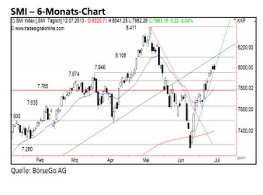 Rückblick: In einer zweigeteilten Verkaufswelle brach der SMI Index bis Ende Juni ein und unterschritt dabei die mittelfristige Aufwärtstrendlinie. Allerdings kamen die Käufer an der Unterstützung bei 7.280 Punkten wieder in den Markt zurück und überwanden umgehend die 7.635 Punkte-Marke.