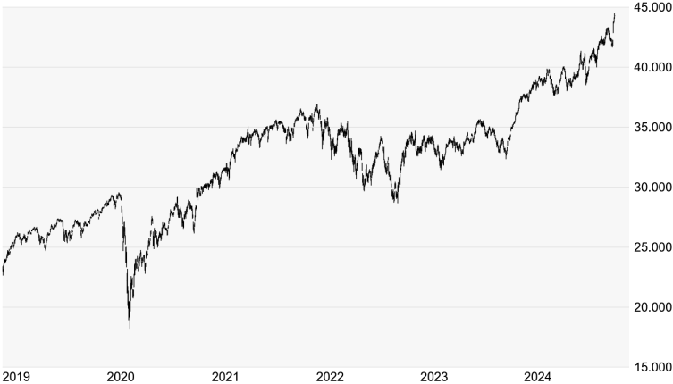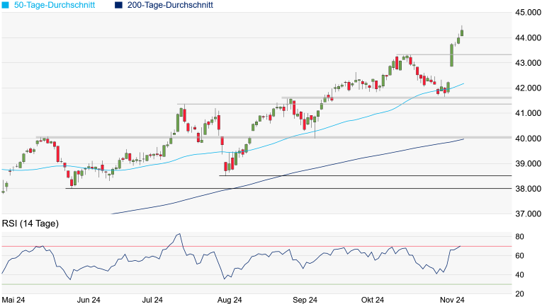 Quelle: Bloomberg. Bitte beachten Sie, dass aus der Wertentwicklung in der Vergangenheit nicht auf die zukünftige Wertentwicklung geschlossen werden kann. | | Charttechnik: Seit feststeht, dass Donald Trump im Januar ins Weisse Haus zurückkehren wird, scheint der Dow Jones kein Halten mehr zu kennen. Mehr als 2.000 Punkte oder beinahe 5 Prozent hat der US-Leitindex seither zugelegt. Das Hoch vom 18. Oktober bei 43.325 Punkten hat der Dow inzwischen deutlich übersprungen. Gestern setzte der US-Leitindex bei 44.487 Punkten eine neue historische Bestmarke. Aktuell ist schwer zu sagen, wohin die Reise noch gehen kann. Die Stimmung an den US-Börsen ist allerdings