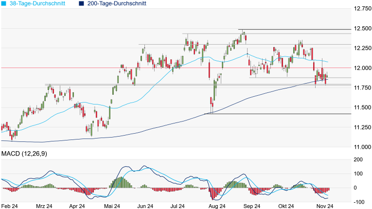 verlaufenden 38-Tage-Durchschnitts. Danach wäre zumindest wieder Platz bis zum Juni-Hoch bei 12.295 Punkten. Auf der Unterseite hat sich der Unterstützungsbereich bei 11.800/11.772 Punkten zuletzt mehrfach als standfest erwiesen. Bei einem nachhaltigen Unterschreiten könnte allerdings Ungemach drohen, denn die nächste Unterstützung würde dann erst am August-Tief bei 11.417 Punkten auftauchen.