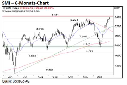 Ausblick: Mit der Rückeroberung der Aufwärtstrendlinie haben sich die Bullen in eine ausgezeichnete Position gebracht und in den Aufwärtstrend zurückkatapultiert. Ein Ausbruch auf neue Verlaufshochs dürfte in Kürze folgen. Die Long-Szenarien: Zunächst sollte sich der laufende Anstieg bis an den starken Widerstand bei 8.411 Punkten fortsetzen. An dieser Stelle könnte es zu Gewinnmitnahmen und einer leichten Korrektur kommen, ehe diese Hürde durchbrochen werden dürfte. Bei einem Anstieg über 8.411 Punkte wäre ein weiteres Kaufsignal aktiviert und ein Kaufimpuls bis 8.500 Punkte zu erwarten. Auf mittlere Sicht hätte der SMI in diesem Fall Aufwärtspotenzial bis 8.675 Punkte gebildet. Die Short-Szenarien: Sollte der Index dagegen unter die kurzfristige Unterstützung bei 8.294 Punkten zurückfallen, dürfte es zu einer leichten Gegenbewegung kommen. Diese sollte jedoch bereits auf Höhe der kurzfristigen Aufwärtstrendlinie, die aktuell bei 8.200 Punkten verläuft, wieder auf Käufer treffen. Ein Ausverkauf unter diesen Bereich würde weitere Abgaben bis 8.150 und darunter gegebenenfalls bis zur zentralen Unterstützung bei 8.093 Punkten nach sich ziehen.
