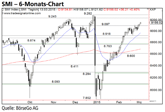 Ausblick: Mit dem Anstieg der letzten Tage hat der SMI auch die letzte markante Hürde vor dem Jahreshoch bei 9.292 Punkten aus dem Weg geräumt. Diese Marke steht jetzt auf der Agenda der Bullen. Die Long-Szenarien: Verbleibt der SMI jetzt über der 9.097 Punkte-Marke, könnte sich die laufende Kaufwelle bis 9.200 Punkte fortsetzen. Darüber käme es zu einem Anstieg bis 9.243 und schliesslich bis zur 9.292 Punkte-Marke. Am bisherigen Jahreshoch müsste man sich auf Gewinnmitnahmen und eine deutliche Gegenbewegung ein - stellen. Im Anschluss an eine solche Korrektur dürfte sich der Aufwärtstrend fortsetzen und bei einem Anstieg über 9.292 Punkte ein weiteres Kaufsignal gebildet werden. Das nächste Ziel einer solchen Rallyausweitung läge bei 9.400 Punkten. Die Short-Szenarien: Rücksetzer unter die 9.097 Punkte-Marke wären aktuell unproblematisch und hätten lediglich eine leichte Korrektur bis 9.000 Punkte zur Folge. Von dort aus könnte sich die Hausse der letzten Wochen unmittelbar fortsetzen. Ein Rückfall unter diese Marke würde dagegen eine Abwärtsbewegung bis an die wichtige kurzfristige Unterstützung bei 8.918 Punkten auslösen. Erst ein Bruch dieser Haltemarke würde ein bearishes Signal liefern und zu einem mehrtägigen Kursrutsch an die 8.763 Punkte-Marke führen.
