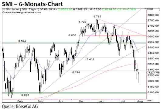 Rückblick: Nach einer ersten Korrekturphase, die im Juli noch im Bereich der Unterstützung bei 8.544 Punkten abgefangen wurde, setzte sich beim SMI Index Ende Juli eine massive Verkaufswelle in Gang.