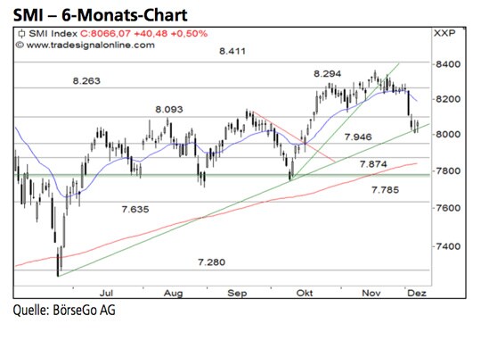 Ausblick: Die kurzfristige Tendenz wurde durch den Ausverkauf der vergangenen Woche komplett zu Gunsten der Bären gedreht. Aktuell gilt es für die Käuferseite Schlimmeres zu verhindern. Die Long-Szenarien: Sollte es den Bullen gelingen, den Wert auf Höhe von 8.000 Punkten zu stabilisieren, könnte es zunächst zu einer leichten Erholung bis 8.093 und darüber bis auf 8.144 Punkte kommen. Doch an dieser Stelle könnte sich bereits eine weitere Verkaufswelle anschliessen. Sollte die Käuferseite den Index dagegen auch über 8.144 Punkte zurückkaufen, wäre mit einer Ausdehnung der Gegenbewe- gung bis 8.230 Punkte zu rechnen. Oberhalb dieses Wider- stands wäre der Aufwärtstrend wieder aufgenommen und ein Anstieg bis 8.365 Punkte zu erwarten. Die Short-Szenarien: Bei einem weiteren Rückfall unter 8.000 Punkte könnte die Unterstützung bei 7.946 Punkten dem SMI kurzzeitig Halt bieten. Wird allerdings auch diese Marke durchbrochen, könnte es zu einer starken mittelfristigen Gegenbewegung kommen, die durchaus bis 7.785 Punkte führen könnte.