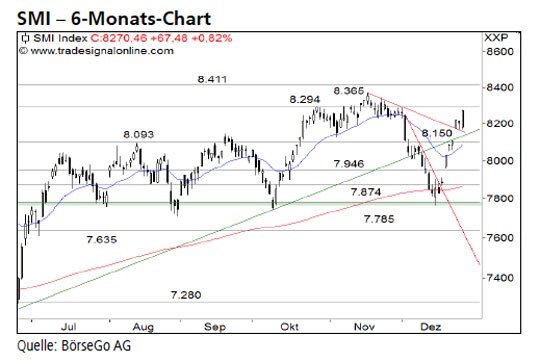 Das in der KeyInvest Daily Markets Analyse vom 23.12. beschriebene Long-Szenario wurde von den Bullen perfekt umgesetzt. Die kurzfristige Verschnaufpause im SMI Index dürfte beendet sein. Allerdings warten jetzt einige Widerstände im Chart auf den Index. Die Long-Szenarien: Zunächst gilt es, den massiven Widerstand bei 8.294 Punkten nachhaltig hinter sich zu lassen. Weitere Hürden im Chart liegen in Form des Novemberhochs bei 8.365 Punkten und bei 8.411 Punkten, dem Hoch aus dem Jahr 2013. Über 8.411 Punkten würde auch im langfristigen Bild der nächste Aufwärtsschub starten. Dieser dürfte den SMI Index an die Barriere bei 8.918 Punkten zurückführen. Die Short-Szenarien: Bereits im Bereich der Kreuzunterstützung bei 8.150 Punkten könnten die Bullen den Index im Falle einer temporären Schwäche wieder auffangen. Kommt allerdings wieder grösserer Verkaufsdruck in den Markt, müsste unterhalb von 8.093 Punkten mit einem weiteren Test der Marke von 7.946 Punkten gerechnet werden.
