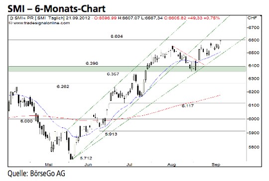 Sollten die Käufer den Schwung der letzten Tage auch in dieser Woche aufrechterhalten, könnte es zu einer steilen Kaufwelle kommen, die durch den Ausbruch über 6.604 Punkte ausgelöst wuürde. Die Long-Szenarien: Oberhalb von 6.604 Punkten kann der Index unmittelbar auf 6.640 Punkte und darüber bereits bis 6.675 Punkte ansteigen. Auf diesem Niveau wäre mit einer stärkeren Korrektur und gegebenenfalls einem Rücksetzer auf die Ausbruchsmarke zu rechnen. Sollten die Bullen den Aufwärtstrend im Anschluss mit einem Ausbruch über den Widerstand bei 6.675 Punkten fortsetzen, könnte der SMI Index bereits bis 6.770 und 6.800 Punkte haussieren. Die Short-Szenarien: Im aktuell deutlich bullishen Umfeld würde erst ein Bruch der Zwischenunterstützung bei 6.521 Punkten zu einer leichteren Korrektur führen. Ausgehend von der Haltemarke bei 6.470 Punkten könnte es jedoch zu einem weiteren Angriff auf die 6.604 Punkte-Marke kommen. Sollte der Index allerdings unter diese Kreuzunter- stützung einbrechen, wäre ein mehrtägiger Ausverkauf bis zur 6.357 Punkte-Marke wahrscheinlich. Gleichzeitig wäre damit auch die übergeordnete Aufwärtstrendlinie durchbrochen und die Wahrscheinlichkeit für eine mittelfristige Korrektur erhöht.