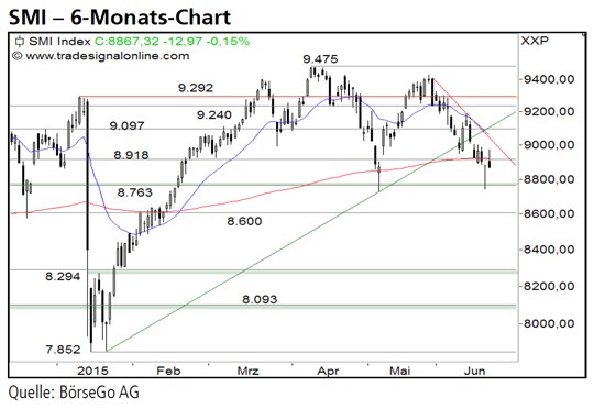 Rückblick: Nachdem der SMI Index in der Vorwoche deutlich unter den seit Januar bestehenden Aufwärtstrend gerutscht war, versuchten die Käufer bis einschliesslich Mittwoch, den Index im Bereich der Unterstützung bei 8.918 Punkten zu halten.