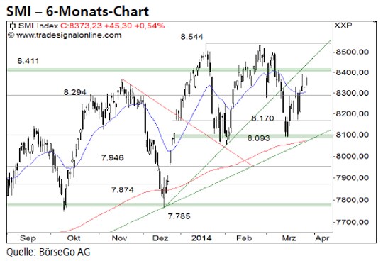 Ausblick: Nachdem die Unterstützungen bei 8.170 und 8.093 Punkten mehrfach bestätigt wurden, dürften die Bullen in den kommenden Tagen einen weiteren Anlauf in Richtung des Widerstands bei 8.411 Punkten starten. Die Long-Szenarien: Steigt der SMI Index über 8.411 Punkte, könnte sich die laufende Aufwärtsbewegung beschleunigen. Ein Test des bisherigen Jahreshochs bei 8.544 Punkten wäre in diesem Fall ein plausibles Ziel für die Handelswoche. Ein kleinerer Widerstand befindet sich bei 8.499 Punkten. Sollte der Wert sogar das Jahreshoch bei 8.544 Punkten überwinden, wäre der Weg auf der Oberseite erst einmal frei. Aus dem Langfristchart wäre dann deutliches Aufwärtspotenzial auf 8.911 Punkten ableitbar. Die Short-Szenarien: Käme es hingegen zu einem Abprallen an der Marke von 8.411 Punkten, könnten die Bären noch einmal ihre Chance wittern und einen Test der Unterstützung bei 8.294 Punkten bewirken. Solange diese Marke allerdings hält, würde es sich nur um eine gesunde Konsolidierung handeln. Erst unter 8.294 Punkten könnte der Anstieg der Vorwoche wieder komplett in Richtung 8.170 Punkte negiert werden.