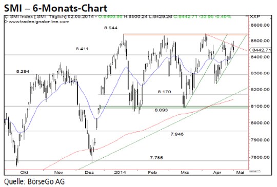 Rückblick: Ausgehend von der Unterstützung bei 8.093 Punkten stieg der SMI Index seit Mitte März an den zentralen Widerstand bei 8.544 Punkten und prallte dort zunächst jedoch nach unten ab.