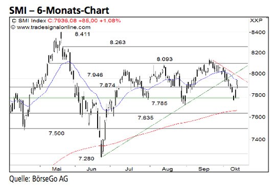 Die seit Juli etablierte Seitwärtsrange im SMI Index ist noch intakt. Bleiben die Bullen aber am Ball, sollte zumin- dest ein Test der oberen Rangebegrenzung machbar sein. Die Long-Szenarien: Der Weg in Richtung Norden wird nicht leicht, da es zunächst den Widerstand bei 7.946 Punkten wie auch den durchbrochenen Aufwärtstrend bei 8.000 Punkten zurückzuerobern gilt. Gelingt dieser Kraftakt, wäre ein Erreichen des Widerstandes bei 8.093 Punkten zu erwarten. Erst oberhalb dieser Marke könnte jedoch von einem charttechnischen Befreiungsschlag gesprochen und die Seitwärtsrange der vergangenen Monate ad acta gelegt werden. Die Short-Szenarien: Da sich in der Vorwoche erneut die Marke bei 7.785 Punkten als wichtige Unterstützung erwiesen hat, gilt es diese aus Bullensicht weiter zu verteidigen. Erst darunter wäre ein Shortsignal aktiv und mit einem Ausverkauf in Richtung des Junitiefs bei 7.280 Punkten zu rechnen.