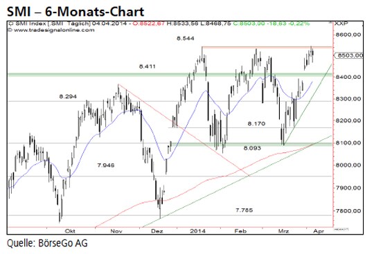 Ausblick: Der Ansturm der Bullen auf das bisherige Rallyhoch lässt aus unserer Sicht den Schluss zu, dass diese Marke in Kürze durchbrochen wird. Dies hätte ein mittelfristiges Kaufsignal beim SMI Index zur Folge. Die Long-Szenarien: Bricht der Wert jetzt nachhaltig über den Widerstand bei 8.544 Punkten aus, käme es zunächst zu einer Kaufwelle bis 8.630 und 8.650 Punkte. Ausgehend von diesem Bereich wäre mit einem kurzen Rücklauf an das frühere Verlaufshoch zu rechnen. Im Anschluss sollte der Wert wieder Fahrt aufnehmen und bei einem Anstieg über die 8.650 Punkte-Marke bis 8.750 Punkte haussieren. Selbst eine Ausweitung der Rally bis 8.800 Punkte wäre in der Folge möglich. Die Short-Szenarien: Bei einem Scheitern am derzeitigen Verlaufshoch wäre hingegen mit einer Korrektur an den markanten Unterstützungsbereich bei 8.411 Punkten zu rechnen. Dort dürften die Käufer jedoch wieder aktiv werden und einen zweiten Ausbruchsversuch in Angriff nehmen. Würde die Marke im weiteren Verlauf durchbrochen, sollte man sich auf eine stärkere Gegenbewegung einstellen. In diesem Fall würde der SMI voraussichtlich bis an die Unterstützung bei 8.294 Puntken ausverkauft werden.