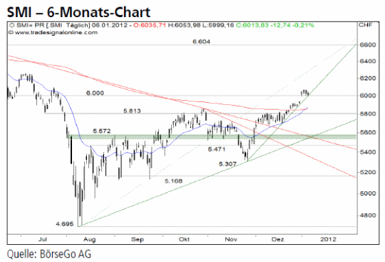 Ausblick: Die Indexmarke von 6.000 Punkten ist nicht nur psychologisch ein wichtiger Faktor. Gerade dieses Niveau diente im Jahr 2011 mehrfach als Unterstützungsbereich. Eine nachhaltige Rückkehr darüber, ist aus Sicht der Technischen Analyse als signifikant für weiter anziehende Indexnotierungen anzusehen. Die Long-Szenarien: Unserer Einschätzung nach ist der Index zwischen 5.813 und 6.000 Punkten hervorragend abgesichert. Weiterer Aufwärtsspielraum bis 6.150 und darüber bis 6.262 Punkten ist gegeben. Temporäre Rücksetzer könnten daher als Chance im Sinne eines Longengagements genutzt werden, um oberhalb von 6.262 Punkten von einem möglichen Anstieg bis zum Indexniveau von 6.604 Punkten profitieren zu können. Die Short-Szenarien: Übernehmen jedoch die Verkäufer das Steuer und führen den Index auf ein Niveau unterhalb von 5.813 Punkte zurück, sollten anschliessende Rücksetzer bis in den Bereich von 5.600 Punkten erwartet werden. Indexnotierungen unter 5.572 Punkte könnten zudem für weitere Abgaben bis 5.307 sorgen. Darunter würden Verluste bis mindestens 5.168 Punkten drohen.