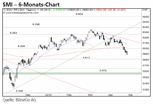 Ausblick: Die Erholung vom Freitag dürfte spätestens im Bereich der Widerstandsbarriere zwischen 6.000 und 6.039 Punkten ihr Ende finden. Die Short-Szenarien: Eine mögliche Erholungsfortsetzung bis in diesen Bereich könnte unserer Auffassung nach die erneute Möglichkeit eröffnen, mit einem Shortengagement an der nächsten Verkaufswelle zu partizipieren. Fällt der Index zu Wochenbeginn bereits unter 5.882 Punkte zurück, sind unmittelbare Rücksetzer bis zur Unterstützung bei 5.813 Punkten zu erwarten. Dort könnte sich der SMI kurzzeitig stabilisieren, bevor darunter der nächste Ausverkauf bis 5.572 Punkte einsetzen kann, welchen man aufgrund des Potentials „short“ handeln könnte. Die Long-Szenarien: Erobert der Index hingegen das Niveau von 6.039 Punkten zurück und schliesst per Tagesschlusskurs darüber, könnte sich die Erholungsbewegung bis zur Abwärtstrendlinie vom März bei aktuell rund 6.160 Punkten fortsetzen. Oberhalb dieser wären im weiteren Verlauf Zugewinne bis 6.262 Punkte denkbar. Ein direkter Ausbruch über die seit März etablierte Abwärtstrendlinie ist nach unserer Einschätzung jedoch wenig wahrscheinlich.