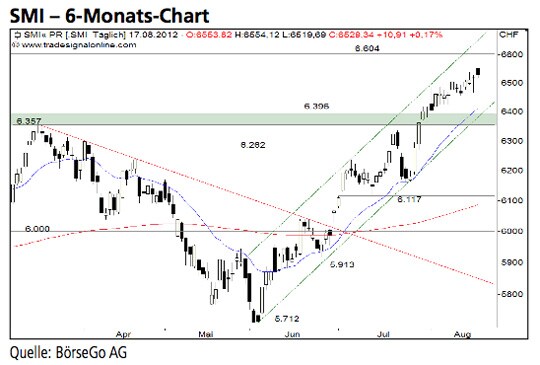 Rückblick: Der SMI durchbrach Anfang Juli den Kreuzwider- stand bei 6.000 Punkten und stieg anschliessend in einem stei- len Aufwärtstrendkanal...
