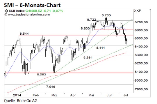 Ausblick: Nach dem Ausverkauf der vergangenen Tage hat der Index eine solide Unterstützungszone im Tageschart erreicht. Eine temporäre Kurserholung ist daher machbar. Doch wird der Weg gen Norden nicht leicht. Die Long-Szenarien: Kurzfristig trifft der SMI Index auf eine Kreuzunterstützung aus einer Horizontalen und einem seit Sommer vergangenen Jahres intakten Aufwärtstrend bei 8.411 Punkten. Somit könnten die Bullen den Index dort zunächst auffangen. Ein Rücklauf an die zuletzt unterschrittene Unterstützung bei 8.544 Punkten wäre idealtypisch. Doch wird eine Rückkehr über diese Marke sehr schwer. Zudem wartet bei 8.600 Punkten ein massiver Widerstand. Erst eine Rückeroberung dieser Marke würde das Chartbild aufhellen. Die Short-Szenarien: Durchbricht der SMI Index hingegen direkt die Unterstützung bei 8.411 Punkten, müsste mit einer Verschärfung der Abwärtsbewegung auf 8.294 Punkte gerechnet werden. Darunter wäre erst wieder bei 8.093 Punkten mit Gegenwehr der Bullen zu rechnen.