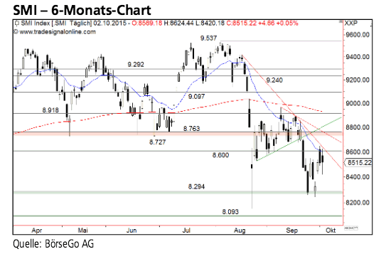 Ab Mitte September übernahmen die Bären jedoch wieder das Kommando und sorgten für einen steilen Kursrutsch bis 8.294 Punkte. Diese Marke wurde nach einer leichten Erholung in der vergangenen Woche erneut angesteuert und verteidigt. Anschliessend sprang der Index mit einem grossen Aufwärtsgap nach oben und erreichte kurzzeitig auch die Hürde bei 8.600 Punkten. Von dort setzte der SMI allerdings in der zweiten Wochenhälfte wieder zurück.