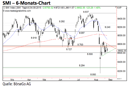 Im August war der SMI Index in einer massiven Verkaufswelle innerhalb weniger Tage von einem neuen Rallyhoch bei 9.537 Punkten in der Spitze bis auf 8.155 Punkte eingebrochen.