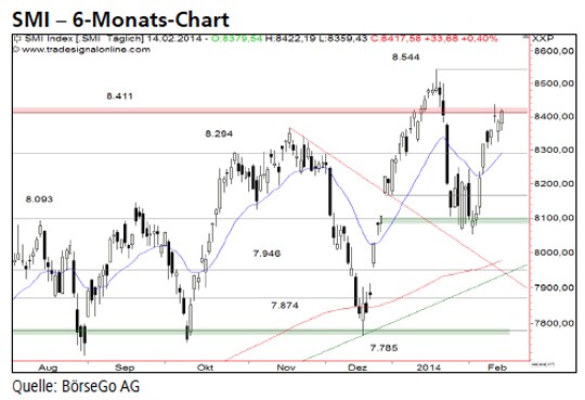 Rückblick: Ausgehend von einem Verlaufshoch bei 8.544 Punkten brach der SMI Index Mitte Januar in einem massiven Ausverkauf bis zur Unterstützung bei 8.093 Punkten ein.