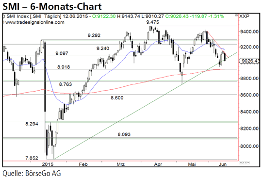 Die Long- Szenarien: Kurzfristig dürfte der Index ein weiteres Mal an die 8.918 Punkte-Marke zurückfallen, dort jedoch eine Stabilisierung vollziehen und anschliessend wieder an die 9.097 Punkte-Marke ansteigen. Wird sie überschritten, könnte die SMI - 6-Monats-Chart Quelle: BörseGo AG SMI - 5-Jahres-Chart Quelle: BörseGo AG 9.240 Punkte-Marke angegriffen werden. Ein Ausbruch über diese Barriere würde zugleich die Oberseite der Flaggenformation überschreiten und damit ein Kaufsignal ausbilden. In der Folge könnte der SMI erneut bis 9.400 Punkte steigen.