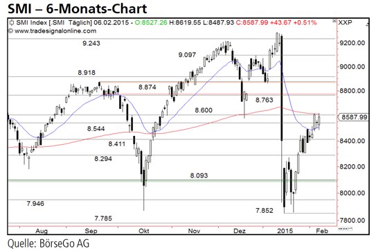 Rückblick: Der massive Kurseinbruch beim SMI Index endete vorerst mit einem Doppelboden bei 7.852 Punkten, dem ab Mitte Januar eine starke Erholung folgte. Dabei sorgte der Ausbruch über den Widerstand bei 8.294 Punkten für ein kurzfristiges Kaufsignal, das weitere Käufer anlockte.