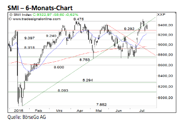 Der SMI Index stieg ab Anfang Juli nach der erfolgreichen Verteidigung der 8.763 Punkte-Marke über die kurzfristige Abwärtstrendlinie und den Widerstand bei 9.097 Punkten an und brach in Folge dieses starken Kaufsignals auch über die Barriere bei 9.292 Punkten aus.