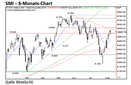 Seit der Ausverkauf beim SMI Index Anfang August bei 8.183 Punkten gestoppt wurde, konnte sich der Wert in einer steilen Erholung direkt wieder nach Norden orientieren.