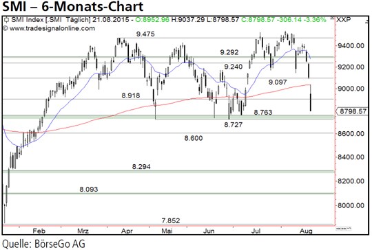 Ausblick: Die Verkaufswelle der Vorwoche hat die Erholung seit Juli zunichte gemacht. Damit droht der SMI jetzt unter die bisherigen Korrekturtiefs einzubrechen. Die Short-Szenarien: Kurzfristig könnte die Unterstützungszone von 8.727 bis 8.763 Punkten angesteuert und in der Folge von den Bullen zu einer leichten Stabilisierung und einer Erholung bis 8.918 Punkte genutzt werden. Sollte die 8.727 Punkte-Marke anschliessend jedoch auf Tagesschlusskursbasis durchbrochen werden, wäre ein mittelfristiges Verkaufssignal gebildet und mit weiteren Verlusten bis 8.600 Punkte zu rechnen. Darunter droht bereits ein mittelfristiger Ausverkauf bis 8.400 Punkte und schliesslich bis 8.294 Punkte. Die Long-Szenarien: Aufgrund der massiven Abgaben und der hohen Abwärtsdynamik würde eine Rückeroberung der 8.918 Punkte-Marke zwar für eine Erholung sprechen, diese könnte jedoch bereits bei 9.000 Punkten enden und ein weiterer Abwärtsimpuls einsetzen. Ein Anstieg über 9.000 Punkte würde dagegen für eine Gegenbewegung bis 9.097 Punkten sorgen. Damit wäre der Abwärtsgap, der am vergangenen Freitag zur Eröffnung gerissen wurde, geschlossen und das kurzfristige Erholungspotenzial zunächst ausgereizt.