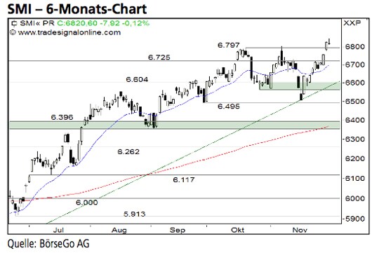 Rückblick: Ausgehend von der Unterstützung bei 6.495 Punkten trieben die Bullen den SMI seit Mitte November in einer steilen Kaufwelle bis an den markanten...