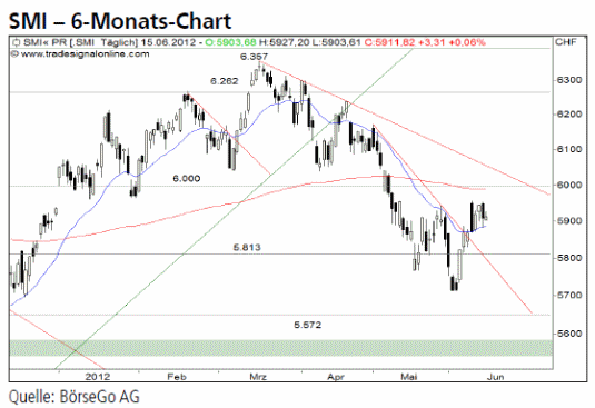 Ausblick: Die getitelte Patt-Situation birgt für den SMI zwar eine gewisse Unsicherheit, doch lassen sich dennoch für die anstehende Woche klare Handelsmarken definieren. Die Bewegungshochs und -tiefs vom 11.06. stehen hierbei im Vordergrund. Ein Ausbruch sollte nach unserer Einschätzung weitere Impulse initiieren. Die Short-Szenarien: Aufgrund der übergeordnet bearishen Tendenz richtet sich der Fokus auf das Niveau bei 5.869 Punkten. Unterschreitet der Index dieses Niveau, sollte es zu nochmaligen Rücksetzern bis 5.813 Punkten kommen. Nimmt im weiteren Verlauf der Verkaufsdruck wieder zu, wäre mit einem Rückgang unter 5.813 Punkten das letzte Zwischentief bei 5.712 Punkten wieder von Interesse. Die Long-Szenarien: Steigt der Index jedoch über den Widerstand bei 5.955 Punkten an, befindet sich das nächste Ziel bei der Marke von 6.000 Punkten. Darüber wäre, mitsamt Bruch der dort verlaufenden Abwärtstrendlinie seit dem Hoch bei 6.357 Punkten, die Möglichkeit weiterer Zugewinne bis in den Bereich von 6.100 bis 6.160 Punkten gegeben. Die Rückkehr über 6.000 Punkte sollte dem Index überdies wieder bullishe Tendenzen für den weiteren Jahresverlauf verleihen können.