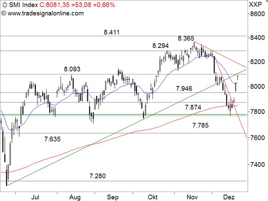 Ausblick: Durch den Anstieg hat sich das Chartbild des SMI Index verbessert. Von einem charttechnischen Befreiungsschlag kann allerdings noch nicht gesprochen werden. Hierfür müssen die Bullen in den kommenden Tagen nachlegen. Die Long-Szenarien: Die Marke von 8.093 Punkten stellt kurzfristig den entscheidenden Widerstand dar. Kann der SMI Index diesen hinter sich lassen und sich in der Folge über 8.093 Punkten etablieren, dürfte der Wert anschliessend den kurzfristigen Abwärtstrend bei 8.180 Punkten ansteuern. Überschreitet er auch diese Trendlinie, wäre ein Kaufsignal aktiv, welches zunächst wieder Kurse von knapp 8.300 Punkten ermöglichen sollte. Auch wäre es dann bis zum Jahreshoch bei 8.365 Punkten nicht mehr weit.