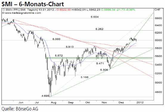 Ausblick: Trotz mangelnder Dynamik war das bisherige Behaupten der Marke von 6.000 Punkten positiv zu sehen. Dennoch durchbrach der Index in der vergangenen Handelswoche die seit November etablierte Aufwärtstrendlinie und deutet daher weitere Schwäche an. Die Short-Szenarien: Nach unserer Einschätzung sollten für die nächsten Tage Verluste bis zur Unterstützung bei 5.813 Punkten eingeplant werden. Ein Rückfall unter diese Marke hätte im weiteren Verlauf Rücksetzer bis in den Bereich von 5.600 Punkten zur Folge. Die Long-Szenarien: Kann sich der Index hingegen wieder oberhalb von 6.000 Punkten etablieren, wäre trotz des Bruchs der kurzfristigen Aufwärtstrendlinie ein Anstieg bis 6.262 Punkte nicht auszuschliessen. Oberhalb davon würde sich zusätzliches Aufwärtspotenzial bis zum Widerstand von 6.604 Punkten erschliessen.