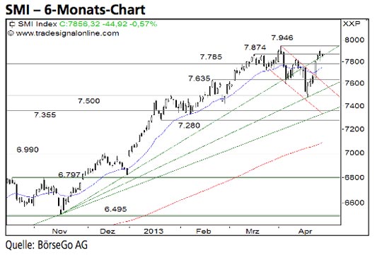 Die Kaufsignale der letzten Tage und die damit verbundene Rückeroberung des zuvor gebrochenen Aufwärts- trends legen den Schluss nahe, dass der SMI in seinen Rallymodus zurückgefunden hat. Lediglich das Verlaufshoch bei 7.946 Punkten bremst die Bullen derzeit noch ein. Die Long- Szenarien: Kurzfristig könnte es zu einer leichten Korrektur bis 7.785 Punkte kommen, ehe das Hoch bei 7.946 Punkten an- gegriffen werden dürfte. Ein Ausbruch über diese Marke hätte ein Kaufsignal und eine weitere Aufwärtsbewegung bis 8.020 Punkte zur Folge. Oberhalb dieser Marke könnte der SMI bereits bis 8.150 Punkte ansteigen. Die Short-Szenarien: Sollte der Wert dagegen deutlich unter 7.785 Punkte zurückfallen, wäre ausgehend von 7.635 Punkten mit einem weiteren impulsiven Anstieg zu rechnen. Erst ein Ausverkauf unter diese Marke würde das vorzeitige Ende der Kaufwelle bedeuten und zu einem Rückfall bis 7.500 Punkte führen.
