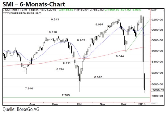Rückblick: Am vergangenen Donnerstag kam es beim SMI Index zu einem exorbitanten Kursrutsch, nachdem die SNB die Mindestgrenze des Schweizer Franken zum Euro überraschend aufgegeben hatte.