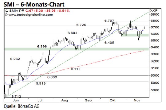 Rückblick: Der SMI Index durchbrach Mitte Oktober eine steile Aufwärtstrendlinie und fiel bis 6.566 Punkte zurück. Von dort kam es zu einem weiteren...