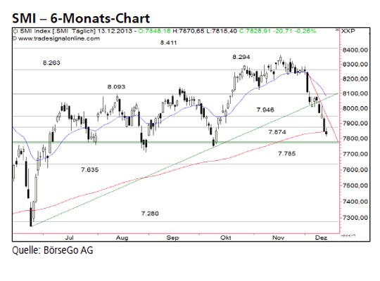 Rückblick: Nachdem der SMI Index Mitte November nach einem neuen Verlaufshoch bei 8.365 Punkten unter die Unterstützung bei 8.263 Punkten zurückgesetzt war, ging der Wert in eine scharfe Korrektur über.