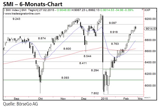 Ausblick: Da der Anstieg der letzten Tage weit fortgeschritten ist und bereits jetzt auf eine weitere starke Hürde trifft, könnte beim SMI eine leichte Korrektur starten. Die Long-Szenarien: Nach dem Erreichen der 9.097 Punkte-Marke könnte eine Gegenbewegung bis 8.918 Punkte einsetzen. An dieser Stelle wäre mit einem Wiederanstieg und einem anschliessenden Angriff auf den Widerstand bei 9.097 Punkten zu rechnen. Sollte es den Bullen gelingen, diese Marke zu durchbrechen, könnte sich der intakte Aufwärtstrend direkt bis an die Widerstandszone von 9.243 bis 9.292 Punkte ausdehnen. Damit wäre es dem SMI geglückt, den scharfen Einbruch im Januar innerhalb von eineinhalb Monaten wieder wettzumachen. Die Short-Szenarien: Setzt der SMI dagegen im weiteren Verlauf unter die 8.918 Punkte-Marke zurück, würde sich die Korrektur vorübergehend ausweiten, ohne den Aufwärtstrend zu gefährden. In diesem Fall käme es zu einer Abwärtsbewegung bis 8.874 Punkte. Darunter könnte sich die Korrektur bis 8.763 Punkte fortsetzen, ehe die Käufer dort wieder stabilisierend in den Verlauf eingreifen sollten. Von der 8.763 Punkte-Marke aus dürfte der nächste mittelfristige Anstieg erfolgen. Wird die Marke unterschritten, käme es zu Verlusten bis 8.600 Punkte.
