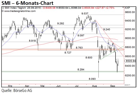 Rückblick: Der SMI Index löste sich nach dem steilen Einbruch im August zunächst von seinen Tiefs und stieg in einer Erholung an den Widerstand bei 8.918 Punkten an.