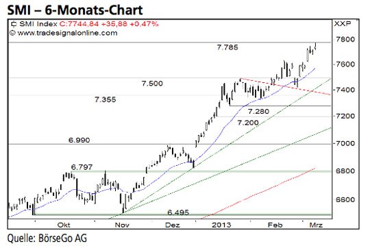 Rückblick: Durch den Ausbruch über die starke Kurshürde bei 7.500 Punkten generierten die Bullen beim SMI Index Anfang Februar ein weiteres Kaufsignal. Zunächst...