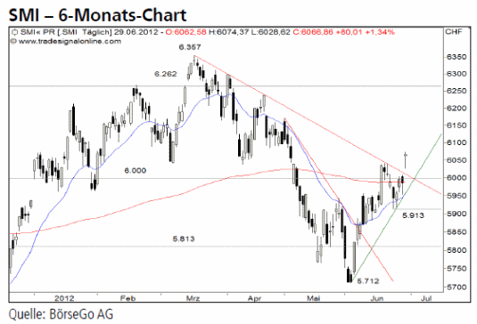 Ausblick: Durch den Bruch der kurzfristigen Abwärtstrendlinie haben sich die Bullen weiteres Aufwärtspotential erarbeitet. Dieser Ausbruch muss nun jedoch bestätigt werden. Die Long-Szenarien: Es ist nach unserer Einschätzung zunächst mit einem Schluss des Eröffnungsgaps zu rechnen. Ausgehend von 6.000 Punkten könnte sich die Erholung im Anschluss in Richtung 6.105 Punkte fortsetzen. Von einer nachhaltigen Trendwende wäre jedoch erst oberhalb des Widerstands bei 6.160 Punkten zu sprechen. Sollte ein Anstieg über diese Marke gelingen, wäre ein Hausse bis 6.262 Punkte möglich. Die Short-Szenarien: Ein Rücksetzer unter die 6.000 Punkte- Marke würde hingegen zu einer ausführlicheren Korrektur bis 5.913 Punkte führen. Von dieser Unterstützung aus könnte der Markt wieder nach oben drehen und die Aufwärtsbewegung fortsetzen. Würde diese Haltemarke jedoch nach unten durchbrochen, wäre ein erstes kurzfristiges Verkaufssignal aktiv. Dies könnte Abgaben bis 5.869 Punkte und darunter auf 5.813 Punkte auslösen.