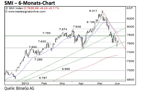 Der Rücksetzer im SMI Index ist bereits weit fortgeschritten. Auf dem aktuellen Niveau bestehen gute Chancen auf eine zumindest kurzfristige Wende. Der Abwärtstrend im Tageschart ist aber noch intakt. Die Long-Szenarien: Ausgehend von der Unterstützungszone um 7.600 Punkte könnten die Bullen eine Kursreaktion einleiten, die den Index zunächst bis an den Abwärtstrend bei 7.720 Punkten zurückbringt. Ein Ausbruch über diese Trendlinie wäre ein erstes positives Signal und Folgegewinne bis auf 7.785 Punkte werden möglich. Kann auch dieser Widerstand überwunden werden, hätte der Wert Luft bis zur nächsten Hürde bei 7.946 Punkten. Die Short-Szenarien: Gibt der Index dagegen das bisherige Konsolidierungstief bei 7.525 Punkten und damit auch den Aufwärtstrend seit 2012 auf, dürfte die Verschnaufpause in die Verlängerung gehen. Die nächste Unterstützung befindet sich erst wieder 245 Punkte tiefer bei 7.280 Punkten. Hier verläuft auch der übergeordnete Aufwärtstrend seit dem Jahr 2011.