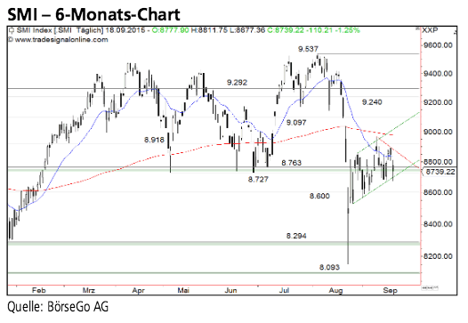 Rückblick: Anfang September setzte sich dieser Anstieg fort und führte den Wert kurzzeitig an den Widerstand bei 8.918 Punkten. Dort ebbte die Kaufwelle ab. Nach einer weiteren Zwischenkorrektur versuchten die Bullen den SMI in der vergangenen Woche wieder über die Hürde bei 8.918 Punkten anzutreiben, scheiterten jedoch und konnten am Freitag auch dem folgenden Rücksetzer unter die 8.763 Punkte-Marke wenig entgegensetzen.