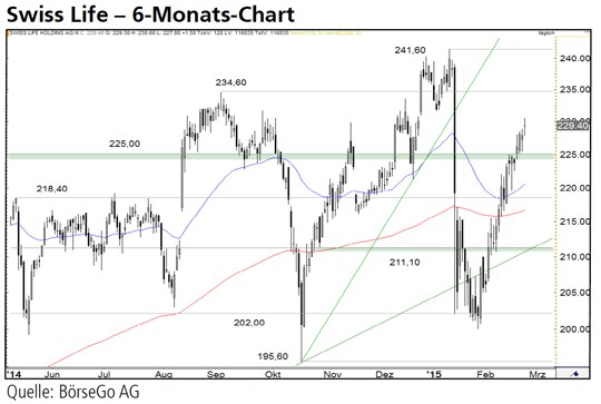 Rückblick: In einem grossen Aufwärtstrend waren die Aktien von Swiss Life bis zum Februar 2014 an den langfristigen Widerstand bei 225,00 CHF angestiegen und hatten damit eine entscheidende Kursmarke erreicht.