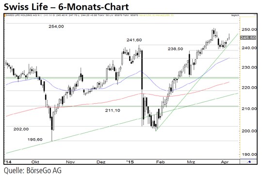 Rückblick: Die Aktien von Swiss Life konnten Mitte Oktober des vergangenen Jahres eine langfristige Aufwärtstrendlinie auf Höhe von 195,00 CHF verteidigen und von dort aus zu einem weiteren steilen Anstieg ansetzen.