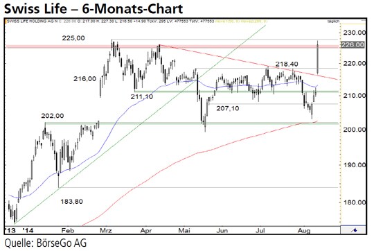 Nach einer leichten Korrektur wurde diese Marke im April erneut angegriffen, konnte jedoch von den Käufern nicht durchbrochen werden. Somit bildete sich ein bearishes Doppelhoch, das eine weitere Korrektur auslöste. Im Mai fiel der Wert dabei an die wichtige Unterstützung bei 202,00 CHF zurück, die von den Bullen schliesslich zum Ausgangspunkt für eine weitere Aufwärtsbewegung genutzt wurde. Diese endete allerdings bereits an der Barriere bei 218,40 CHF und ein weiterer Kursrutsch führte die Aktien an die 202,00 CHF-Marke zurück. Das somit ausgebildete Doppeltief rief die Bullen auf den Plan, die in den vergangenen Tagen für einen steilen Aufwärtsimpuls sorgten. Dieser beschleunigte sich im gestrigen Handel nochmals deutlich: Mit einem Aufwärtsgap startete der Wert in den Handel, übersprang eine kurzfristige Abwärtstrendlinie, durchbrach den Widerstand bei 218,40 CHF und erreichte schliesslich die zentrale Kurshürde im Bereich von 225,00 CHF.