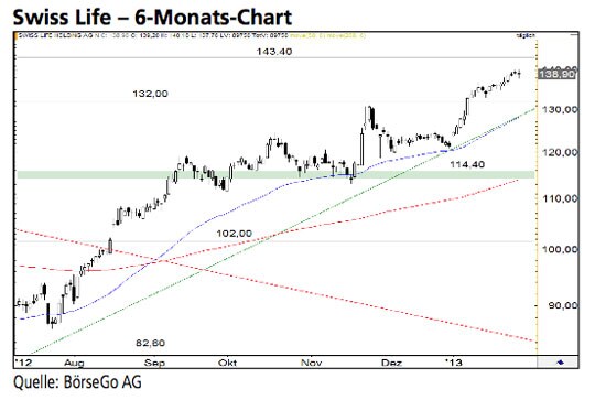 einer leichten Gegenbewegung kommen. Sollte die Marke im weiteren Verlauf jedoch ebenfalls überschritten werden, ist ein Anstieg bis 166,20 CHF möglich. Entsprechend könnte man einen erfolgreichen Ausbruch über 143,50 CHF „long“ handeln. Die Short-Szenarien: Sollte es den Bullen dagegen misslingen, die 143,50 CHF-Marke zu durchbrechen, wäre mit einer Korrektur bis 132,00 CHF zu rechnen. Auf diesem Niveau könnte es zu einer Stabilisierung und einem weiteren Anstieg kommen. Sollte diese Unterstützung dagegen dem Ansturm der Bären zum Opfer fallen, wäre die mittelfristige Aufwärtstrendlinie gebrochen. Dieses tendenziell bearishe Signal hätte weitere Abgaben bis 120,90 CHF zur Folge. Selbst eine Korrekturausweitung bis 114,40 CHF wäre in diesem Fall möglich.