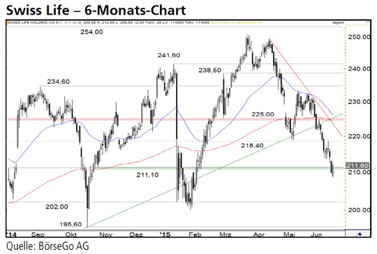 Ausblick: Die enorme Abwärtsbewegung der letzten Wochen hat die vorherige Hausse bei den Aktien von Swiss Life abrupt beendet. Weitere Verluste dürften in Kürze folgen. Die Short- Szenarien: Bei einem nachhaltigen Bruch der 211,10 CHF-Marke wäre mit einem Ausverkauf bis 202,00 CHF zu rechnen. An dieser Stelle, dem Startpunkt der Rally von Mitte Januar, könnte den Bullen eine kurzfristige Erholung gelingen. Wird die Marke anschliessend durchbrochen, dürfte sich die Verkaufswelle direkt bis 202,00 CHF ausdehnen. Darunter würde bereits die Unterstützung bei 195,60 CHF angesteuert. Aufgrund der aktuellen Schwäche wäre sogar mit einem Einbruch bis 190,00 CHF zu rechnen. Die Long-Szenarien: Bei Kursen oberhalb von 211,10 CHF könnte es zwar zu einer Zwischenerholung bis 218,40 CHF kommen. Diese Barriere sollte einen solchen Anstieg jedoch beenden und einen erneuten Ausverkauf unter die 211,10 CHF-Marke in Richtung 202,00 CHF auslösen. Überwinden die Bullen dagegen diese Hürde, könnten die Aktien bis 225,00 CHF klettern. Bei einem Ausbruch über den Widerstand käme es zu einer Kaufwelle bis 234,60 CHF.