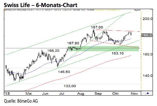 Ausblick: Die seit September laufende Konsolidierung steht kurz vor ihrer Beendigung. Innerhalb des langfristigen Aufwärtstrends könnten die Aktien in Kürze den nächsten Aufwärtsschub starten. Die Long-Szenarien: Bereits ein Über- schreiten des Vorwochenhochs bei 185,00 CHF wäre positiv zu werten und würde auf ein Konsolidierungsende hinweisen. Sicher beendet wäre die Verschnaufpause allerdings erst, wenn auch das Augusthoch bei 187,00 CHF den Bullen zum Opfer fällt. Gelingt dieser charttechnische Befreiungsschlag, wäre der nächste mittelfristige Widerstand erst bei 225,00 CHF auszumachen. Hier treffen sich eine horizontale Hürde und die Trendkanaloberkante zu einem Kreuzwiderstand. Die Short-Szenarien: Solange die genannten Chartmarken auf der Oberseite nicht überwunden wurden, ist auch eine Konsolidierungsausdehnung auf der Unterseite noch möglich. Bereits bei 172,00 CHF befindet sich aber in Form einer massgeblichen Trendlinie eine solide Unterstützung. Spätestens an der Kurszone zwischen 168,00 und 163,00 CHF dürften sich die Bären letztlich verausgaben und ein neuer Aufwärtsimpuls starten.