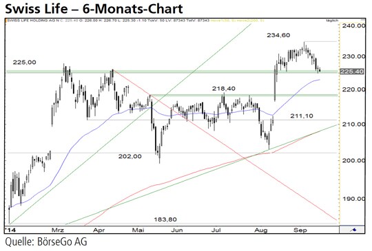 In der Folge dieses kurzfristigen Trendwendesignals setzte der Wert bis Anfang Mai an die Unterstützung bei 202,00 CHF zurück. An dieser Stelle kam es zu einem Konter der Bullen, die die Aktien entlang der Unterseite der zuvor durchbrochenen Aufwärtstrendlinie an den Widerstand bei 218,40 CHF antrieben. Nach mehreren gescheiterten Ausbruchsversuchen fiel der Wert im Juli vorübergehend erneut auf die Unterstützung bei 202,00 CHF zurück. Der somit gebildete bullishe Doppelboden bremste diesen Angriff der Verkäufer schliesslich ab und mündete in einen massiven Anstieg: Anfang August führte eine starke Kursexplosion zu einem Aufwärtsimpuls, der die Aktien deutlich über den Widerstand bei 225,00 CHF ausbrechen liess. In der Spitze stiegen die Aktien von Swiss Life bis 234,60 CHF. Ausgehend von diesem neuen Jahreshoch läuft seit einigen Tagen der bullish zu wertende Rücklauf an das frühere Hoch bei 225,00 CHF.